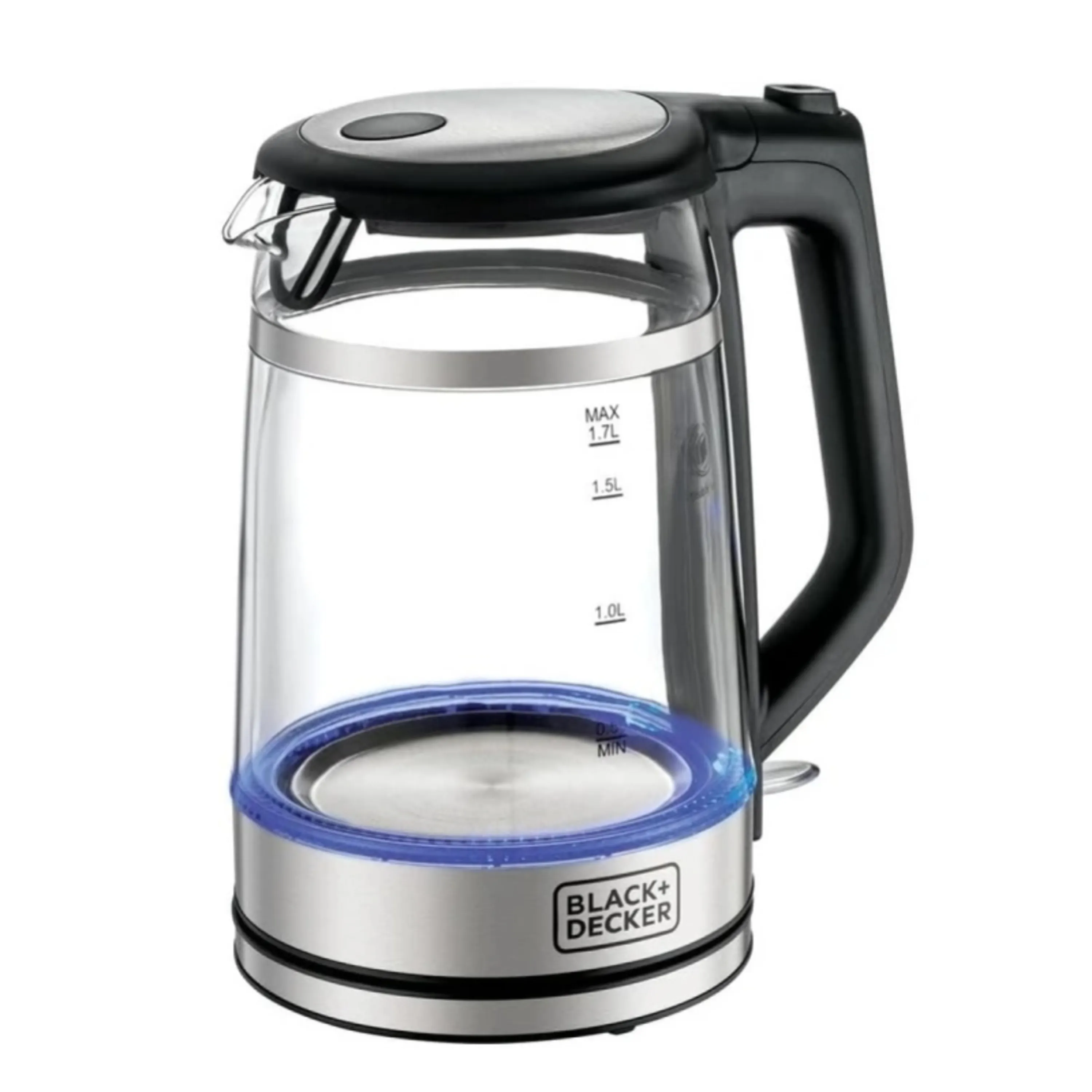 کتری شیشه ای دوجداره 1.7 لیتری با روکش فولادی ضد زنگ ممتاز برای دوام بیشتر، محافظ روکش دوجداره برای جذب ضربه های متداول، طراحی بی سیم 360 درجه، حلقه LED آبی روشن برای ظاهر و احساس زیبا، 2200 وات، بدنه شیشه بوروسیلیکات، خاموش شدن خودکار